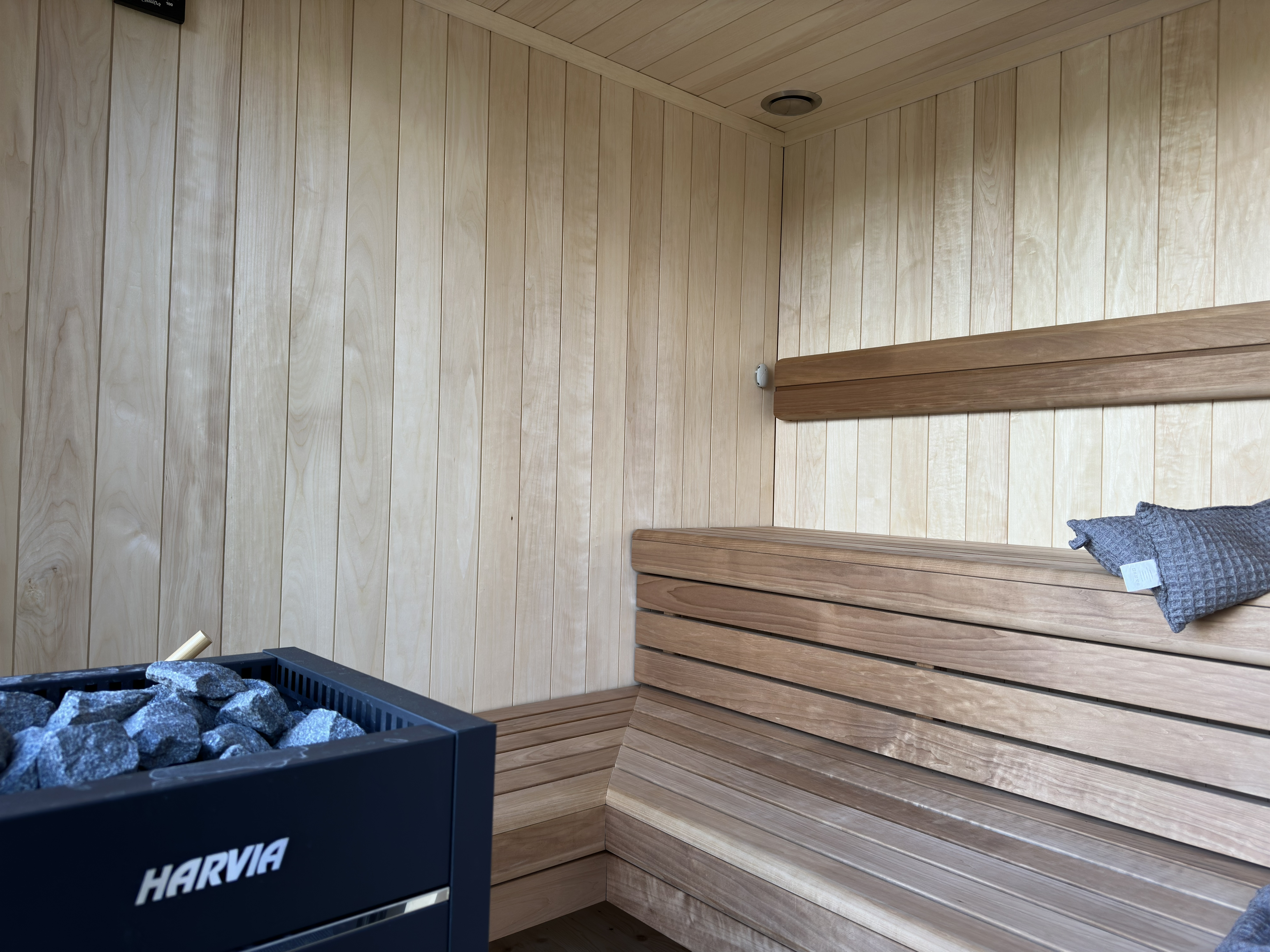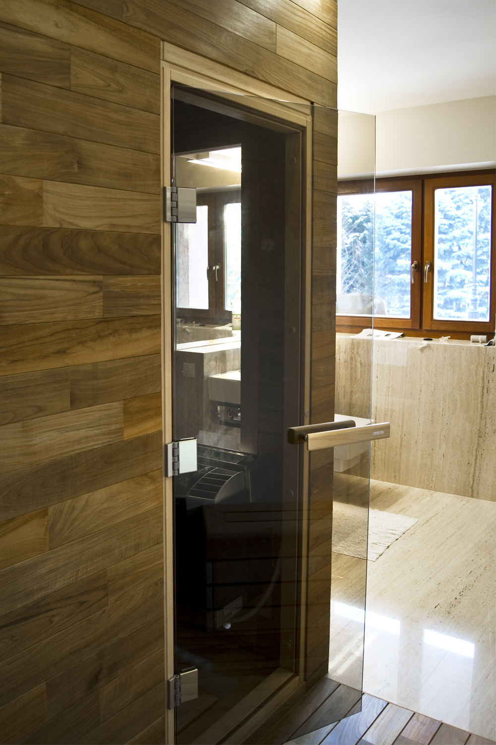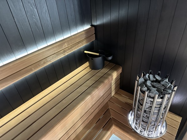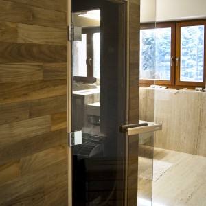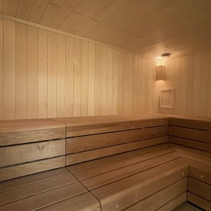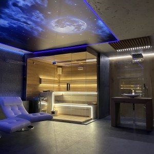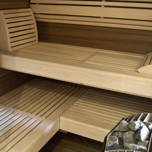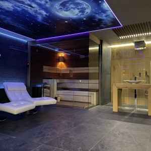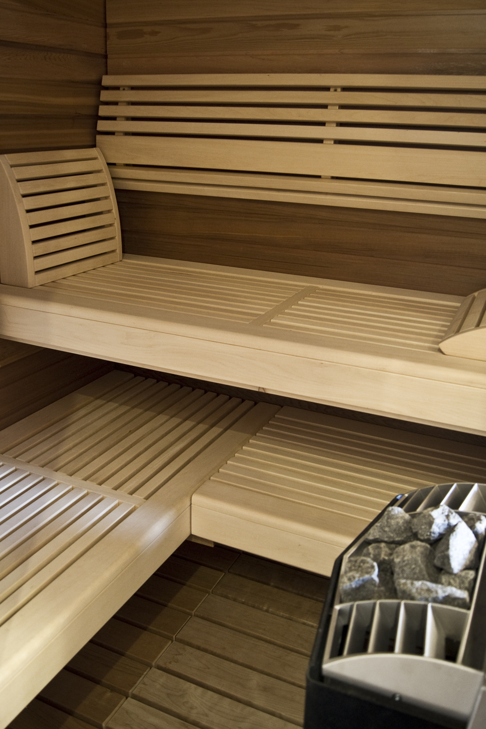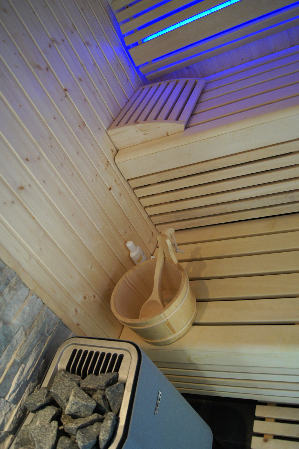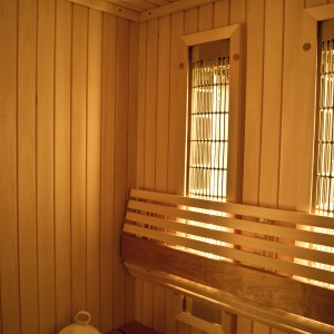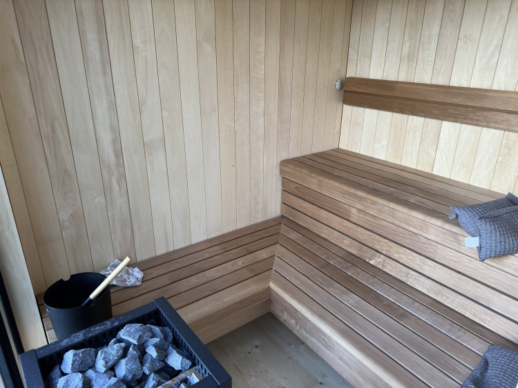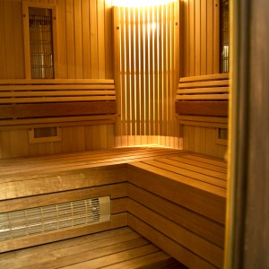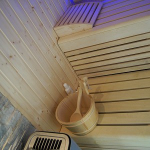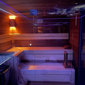 Wnętrze sauny wykonane z osiki skandynawskiej naturalnej w połączeniu z osiką termo. Sauna wyposażona w wannę z hydromasażem i piec dwufunkcyjny pozwalający na kąpiele ziołowo-aromatyczne