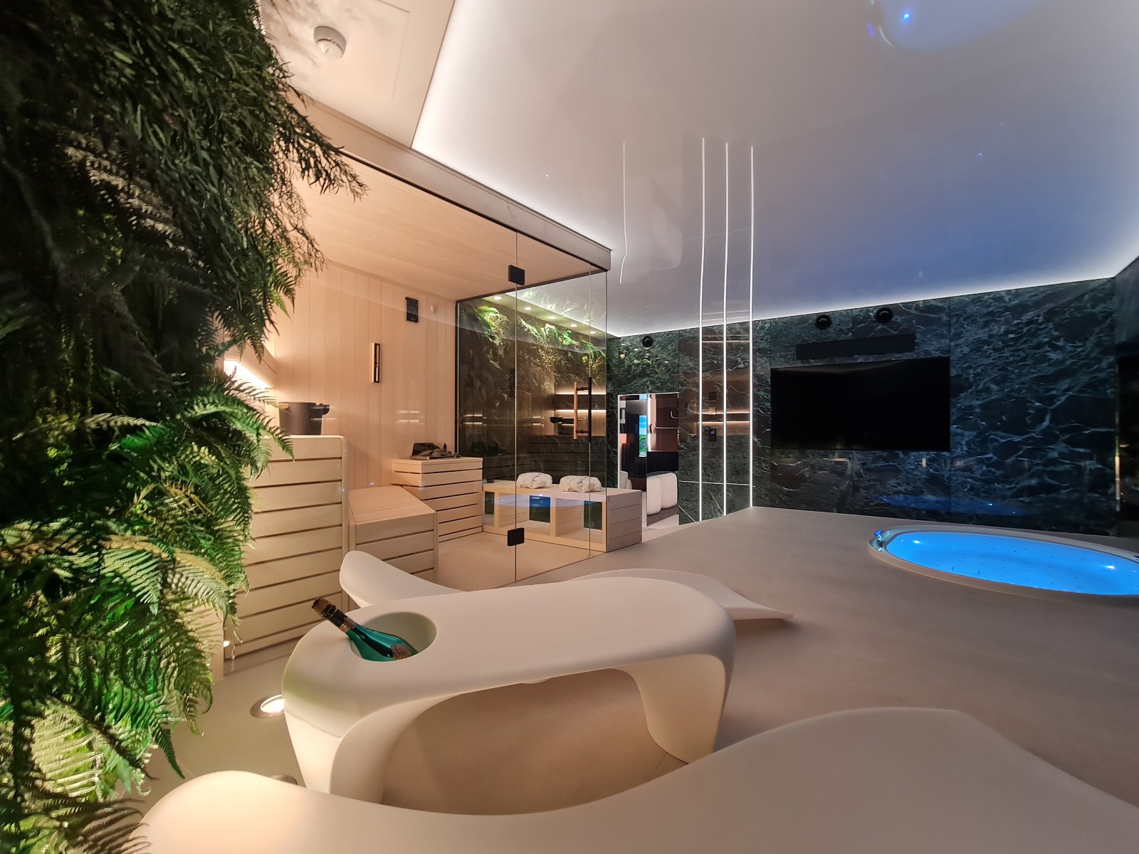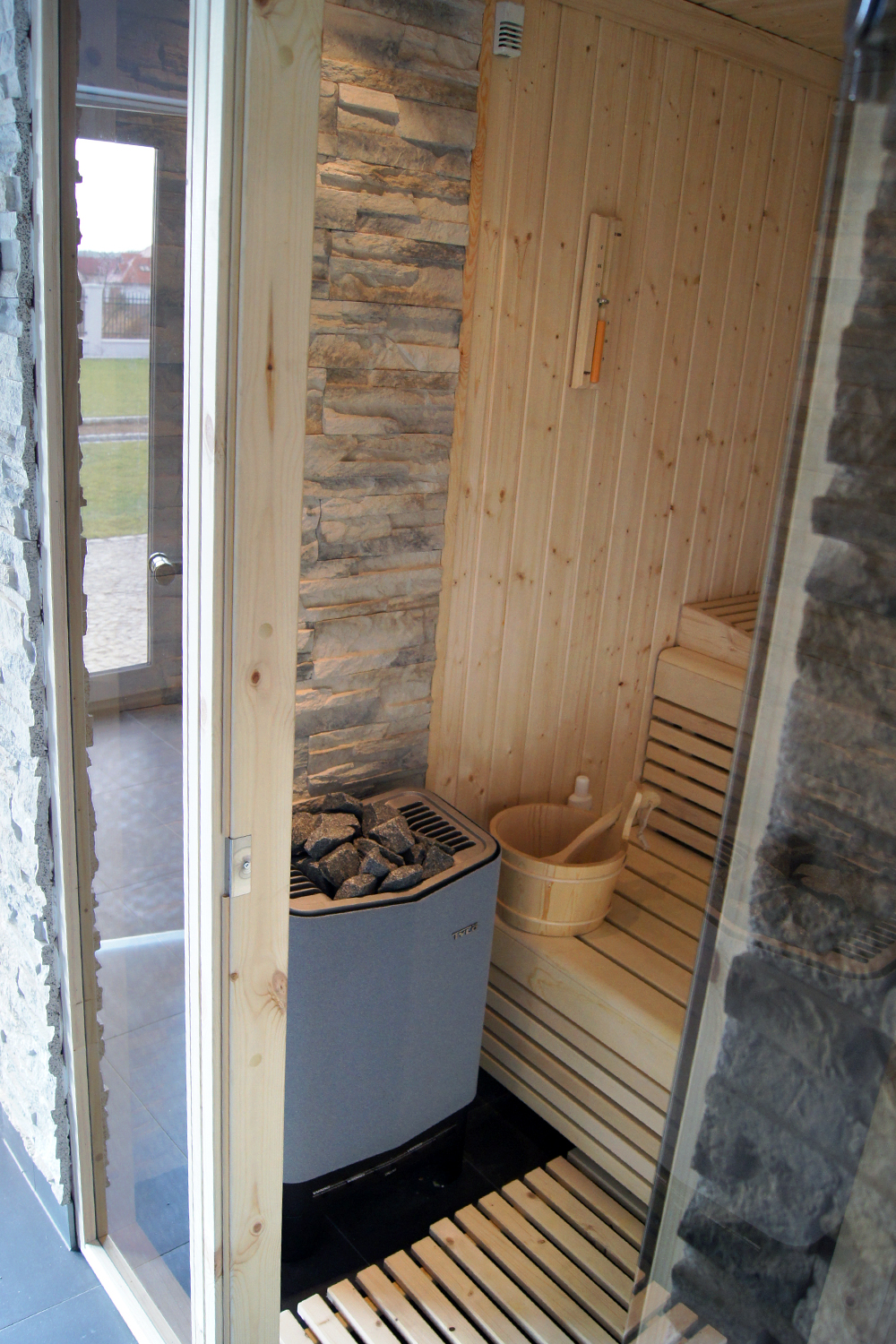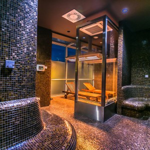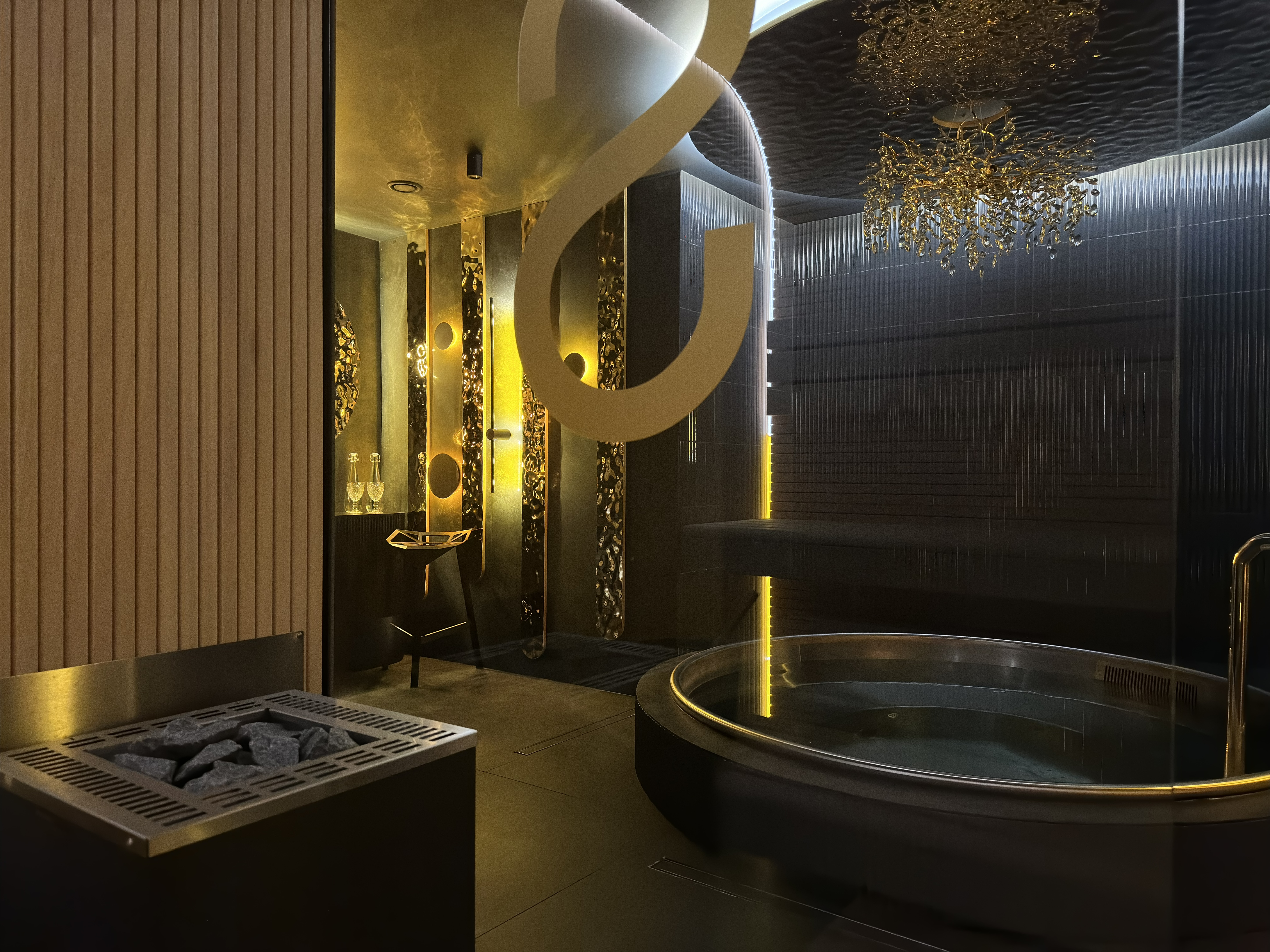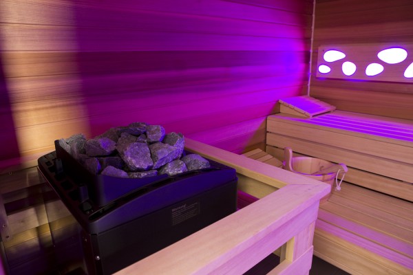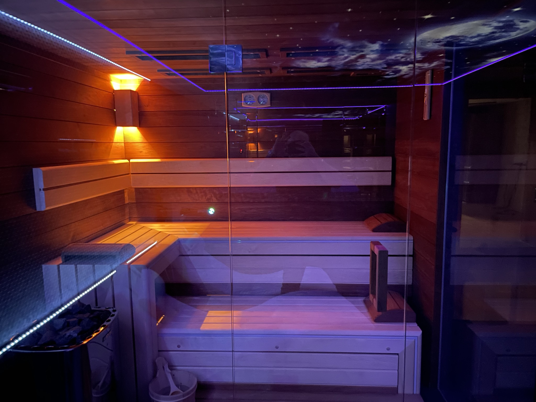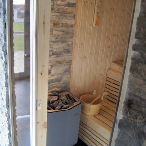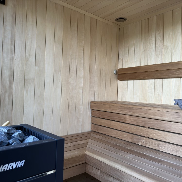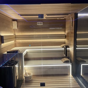 Wnętrze sauny wykonane z osiki skandynawskiej naturalnej w połączeniu z osiką termo. Sauna wyposażona w wannę z hydromasażem i piec dwufunkcyjny pozwalający na kąpiele ziołowo-aromatyczne