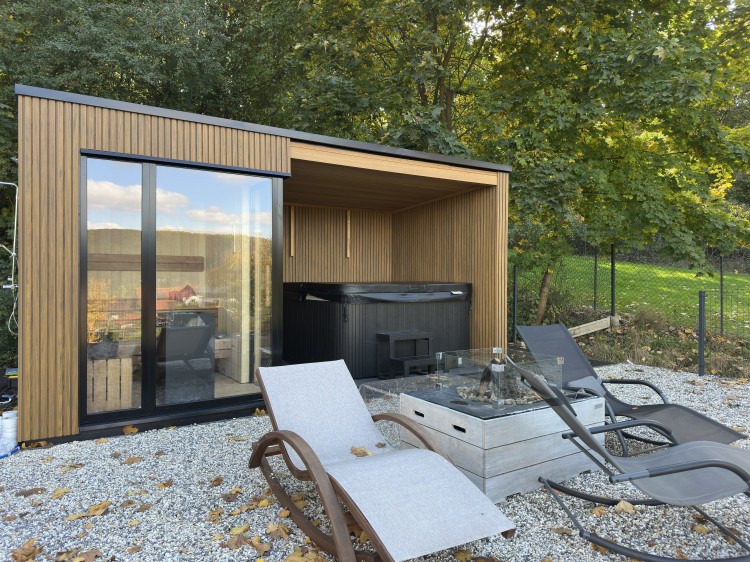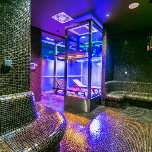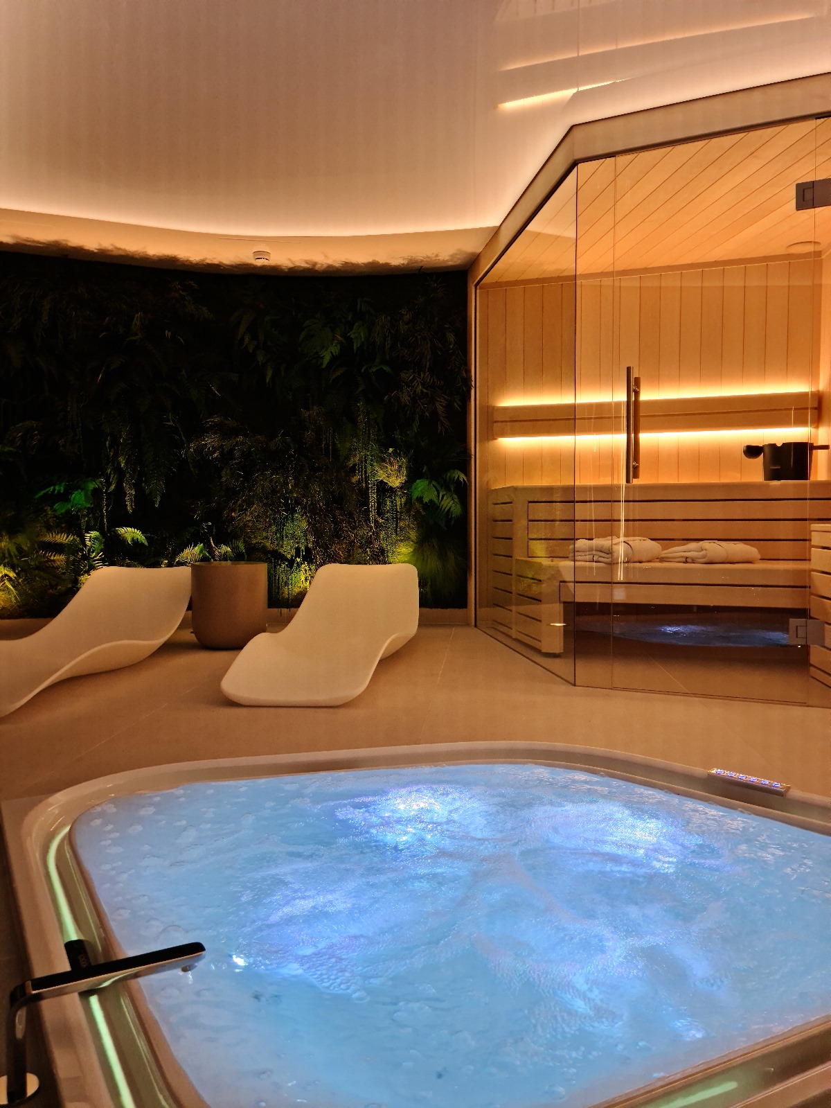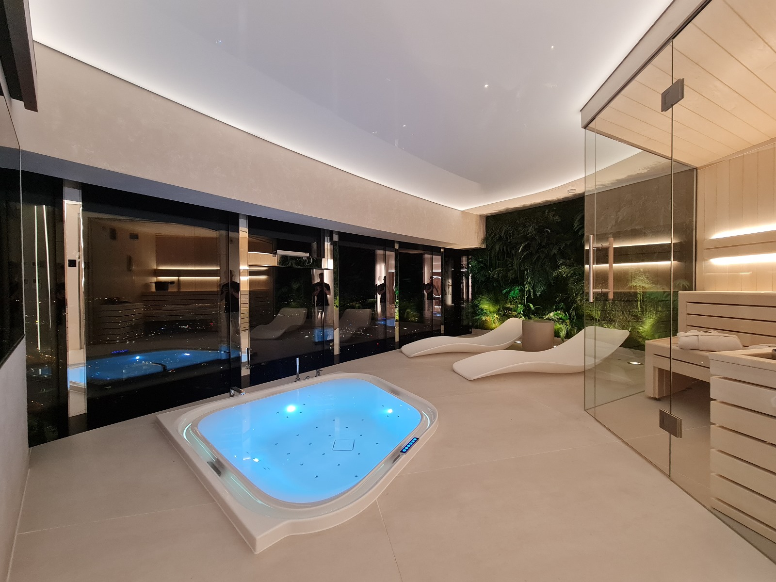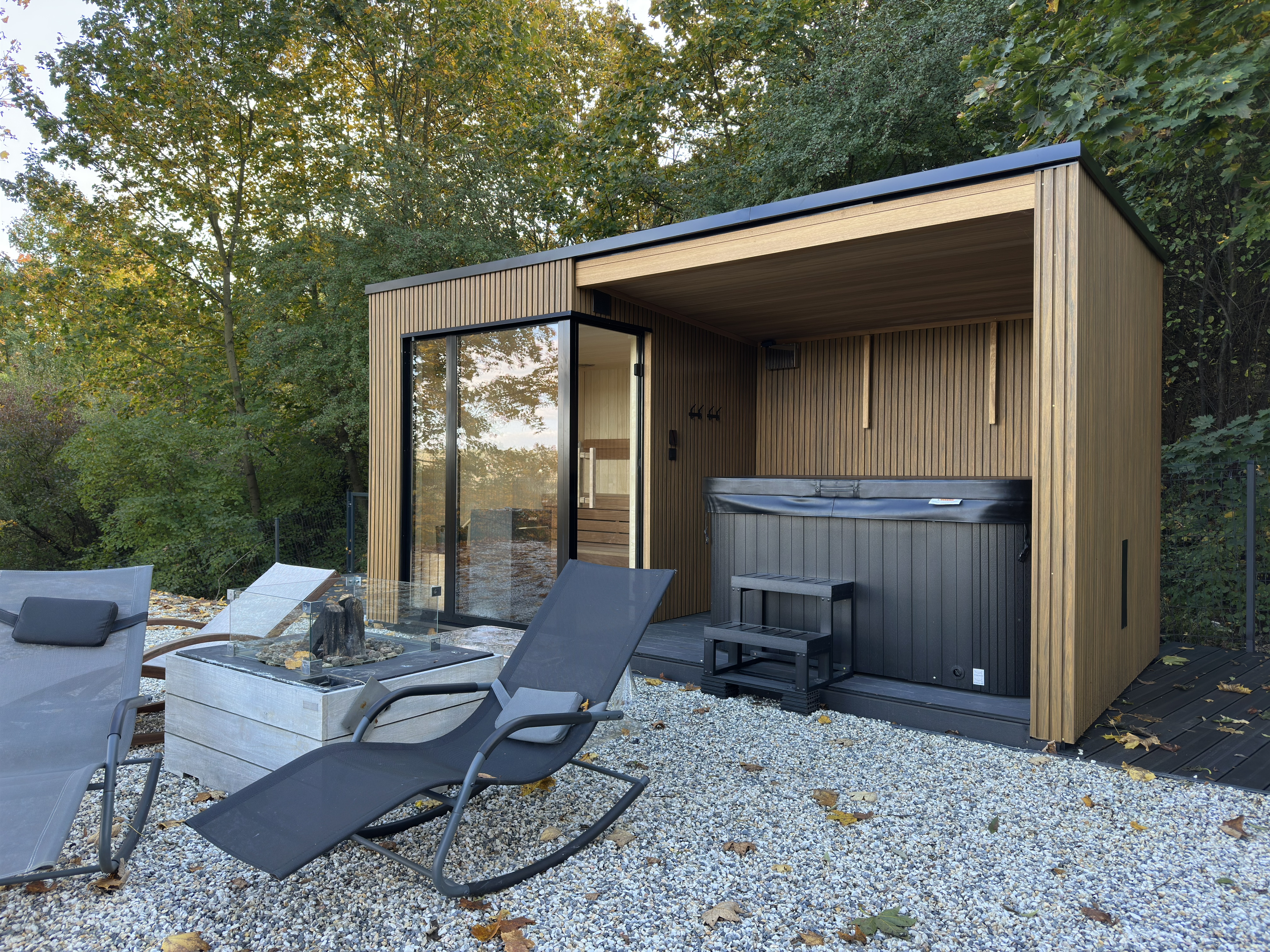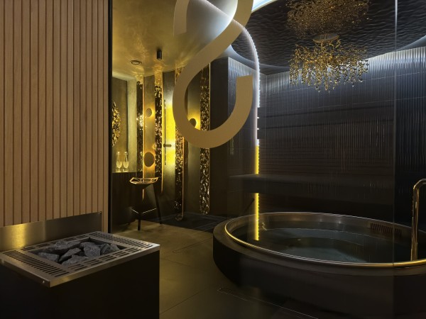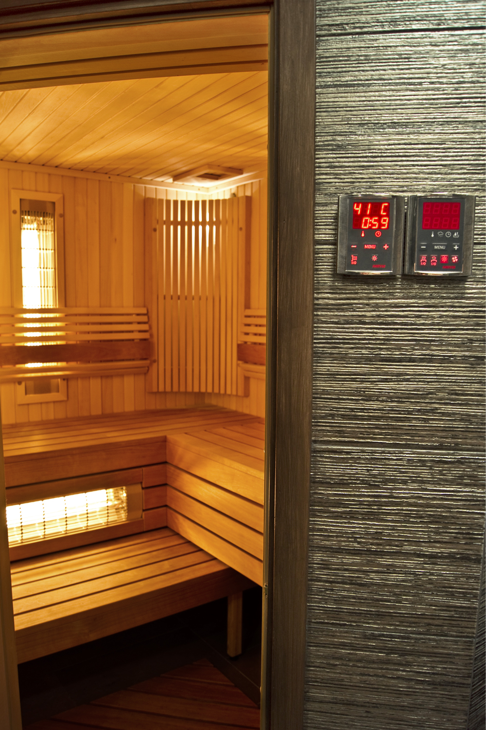 Wnętrze sauny wykonane z osiki skandynawskiej naturalnej w połączeniu z osiką termo. Sauna wyposażona w wannę z hydromasażem i piec dwufunkcyjny pozwalający na kąpiele ziołowo-aromatyczne