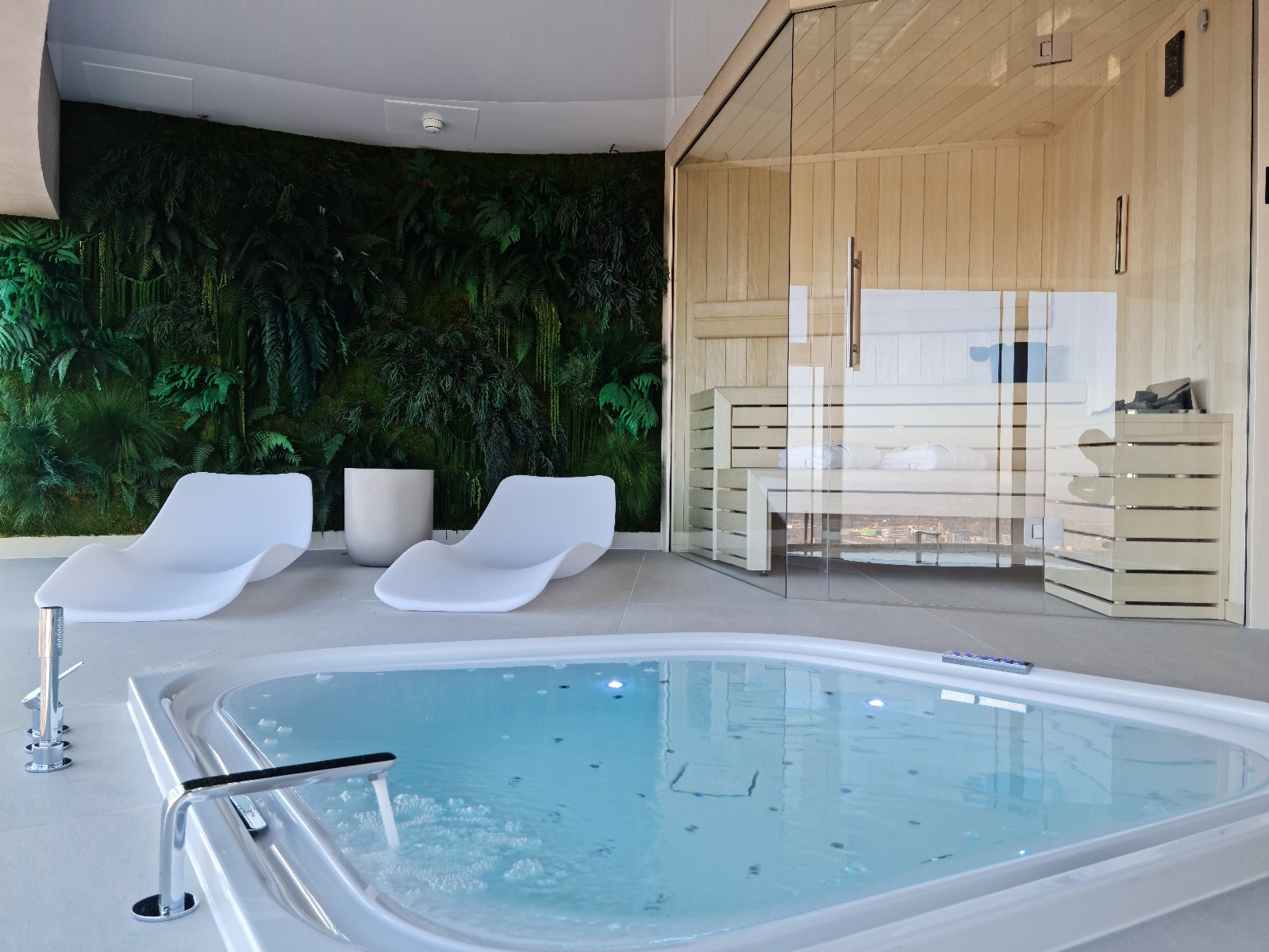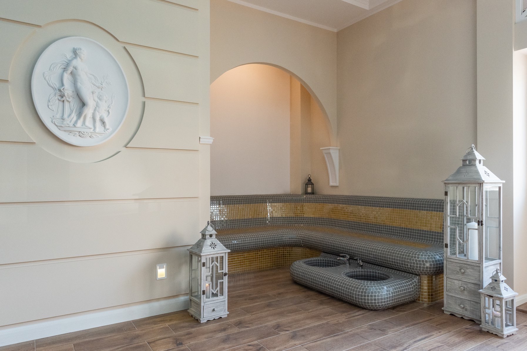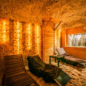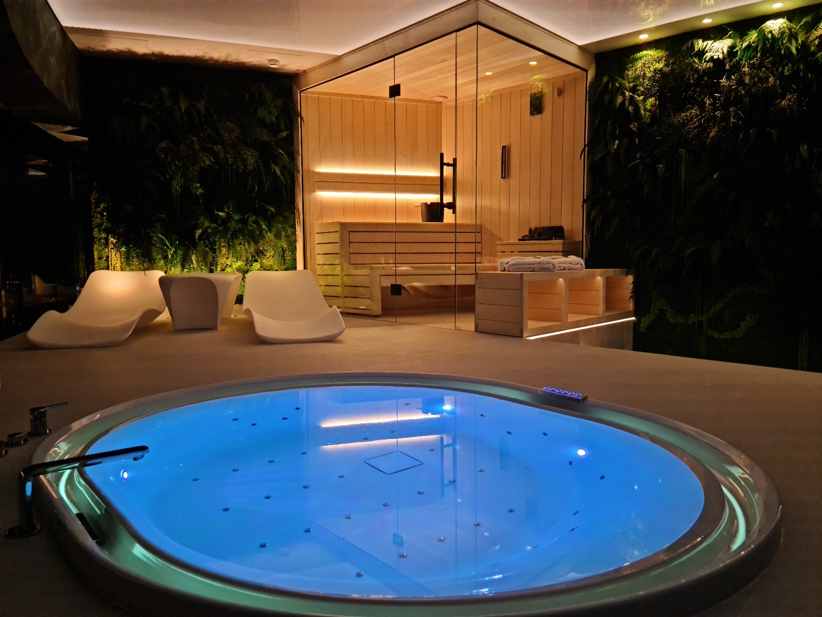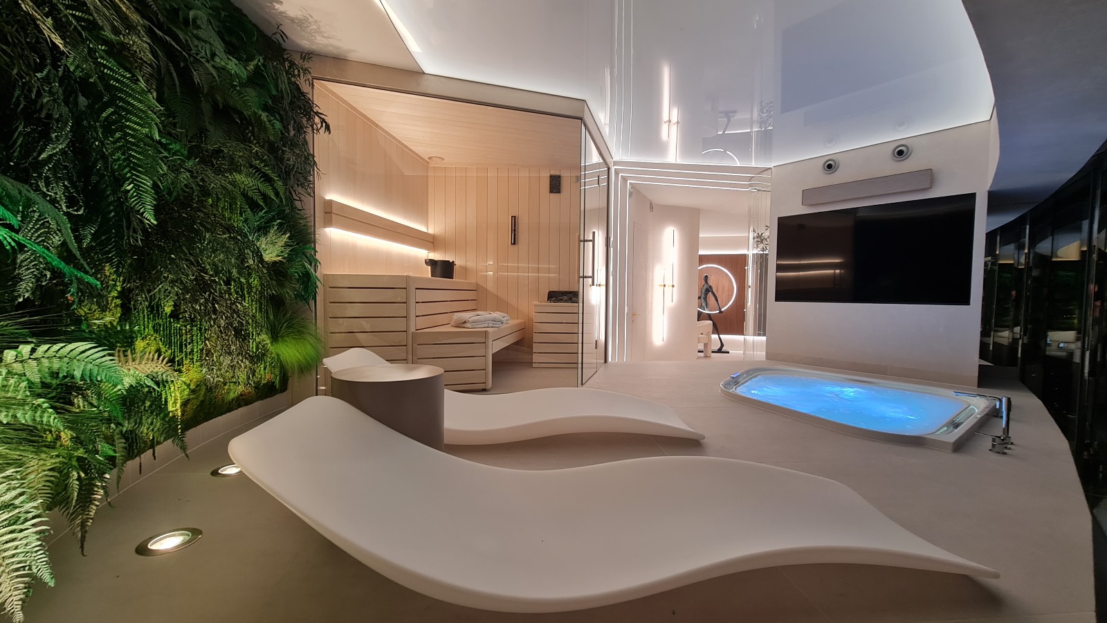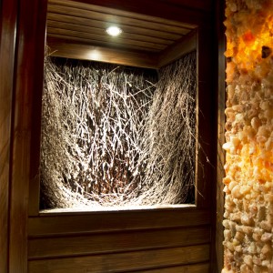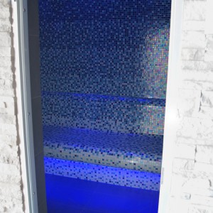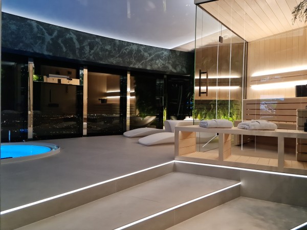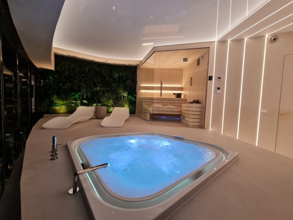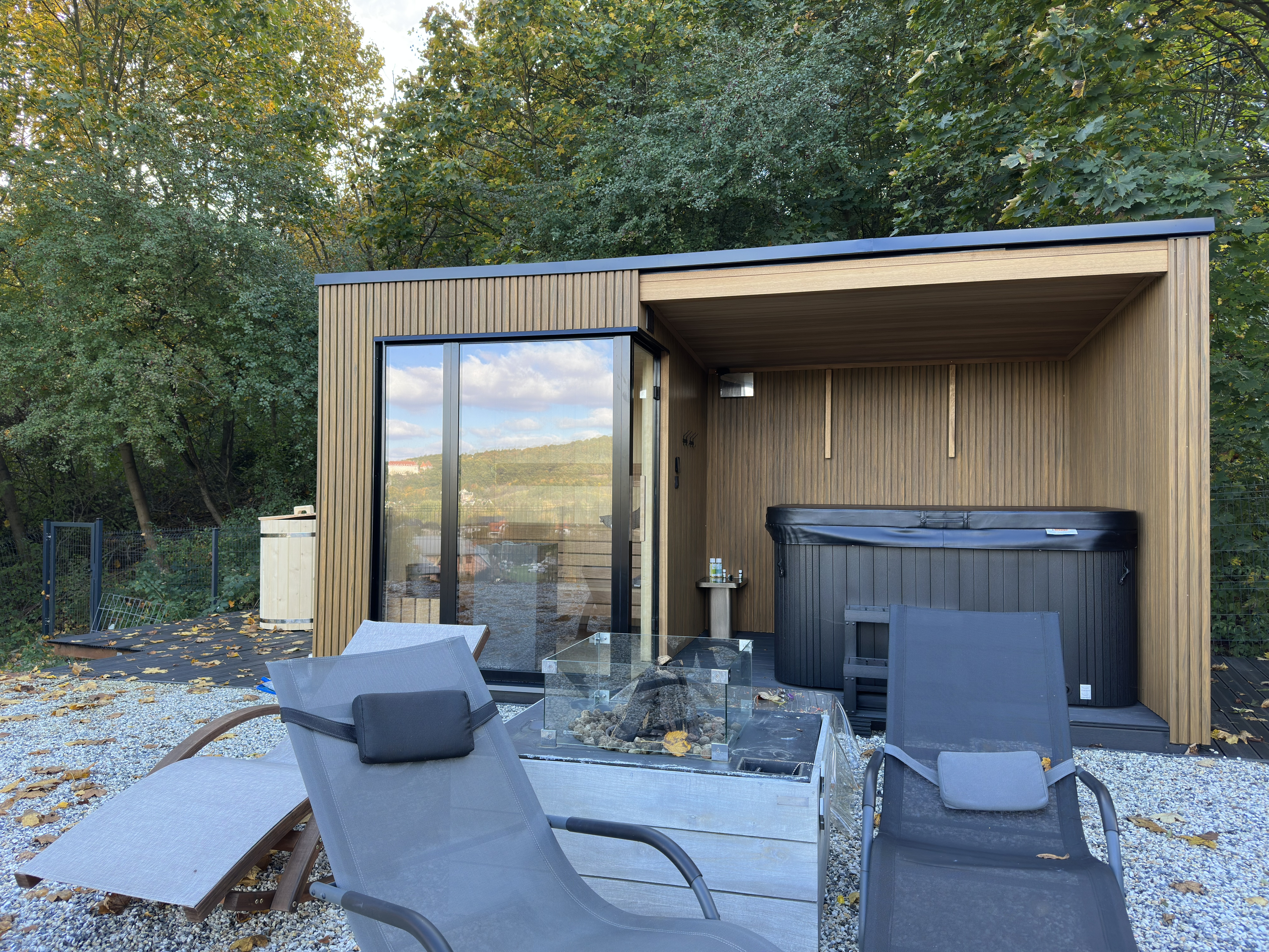 Wnętrze sauny wykonane z osiki skandynawskiej naturalnej w połączeniu z osiką termo. Sauna wyposażona w wannę z hydromasażem i piec dwufunkcyjny pozwalający na kąpiele ziołowo-aromatyczne