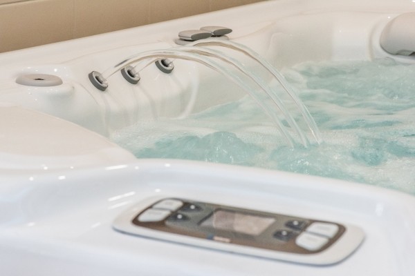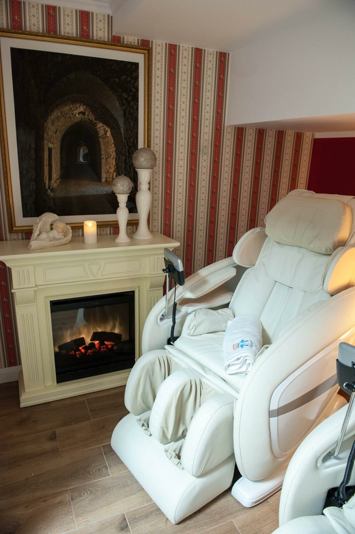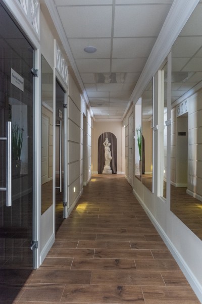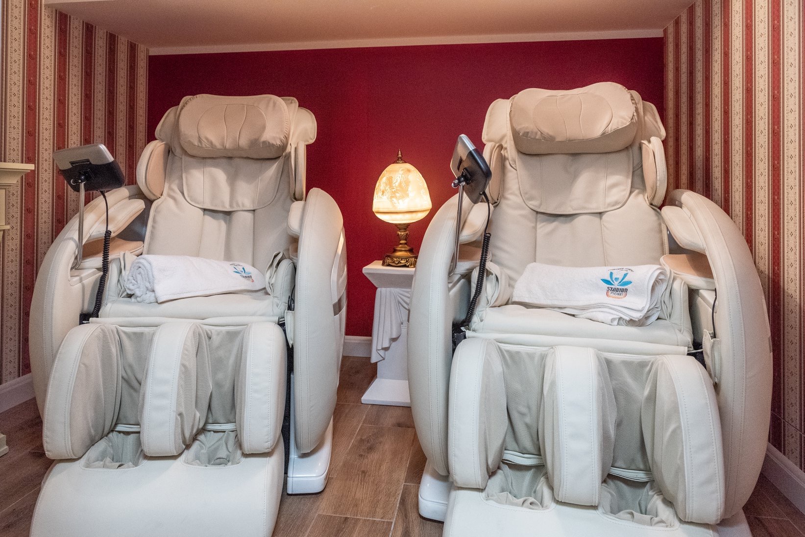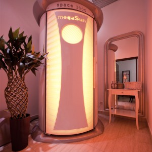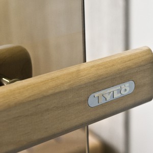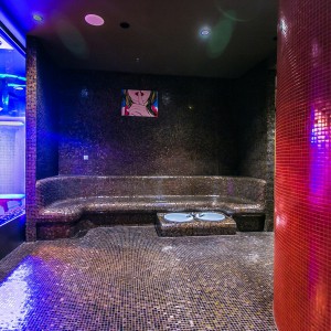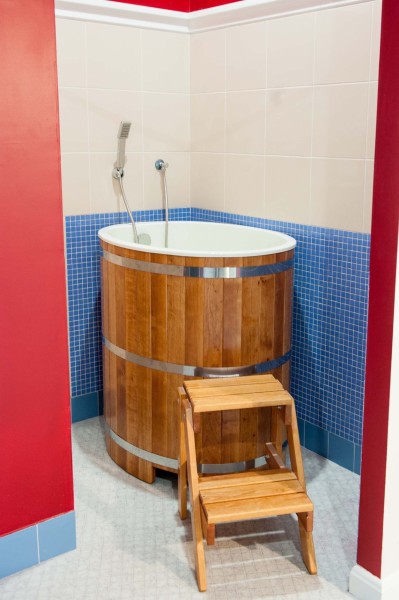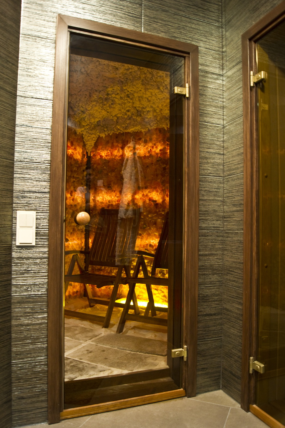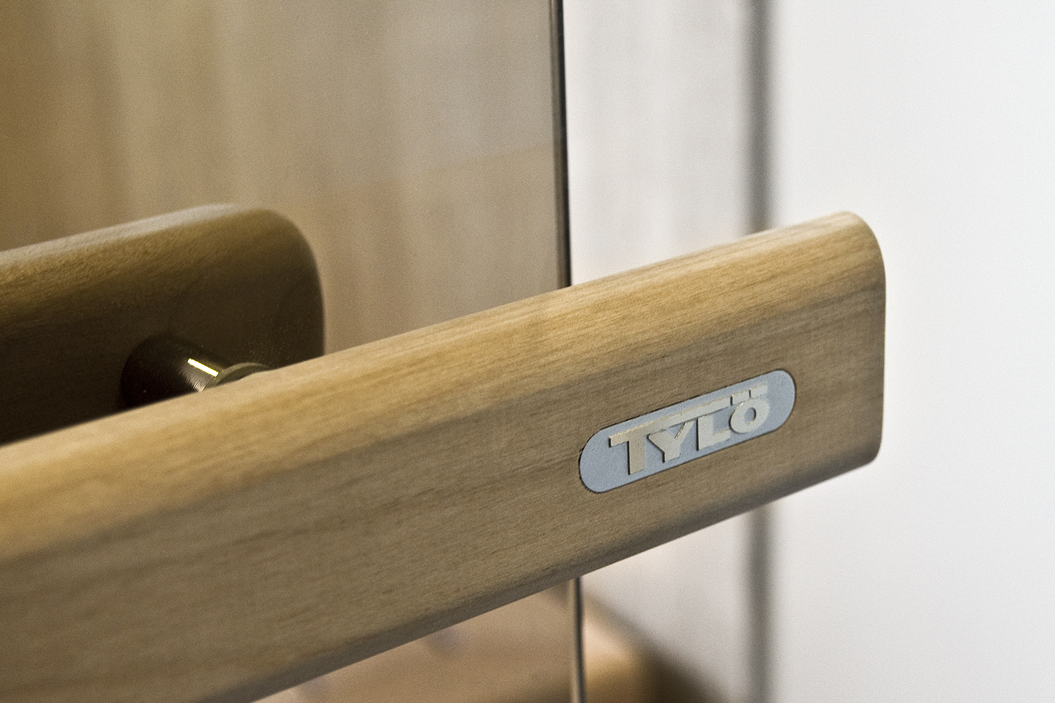Wnętrze sauny wykonane z osiki skandynawskiej naturalnej w połączeniu z osiką termo. Sauna wyposażona w wannę z hydromasażem i piec dwufunkcyjny pozwalający na kąpiele ziołowo-aromatyczne